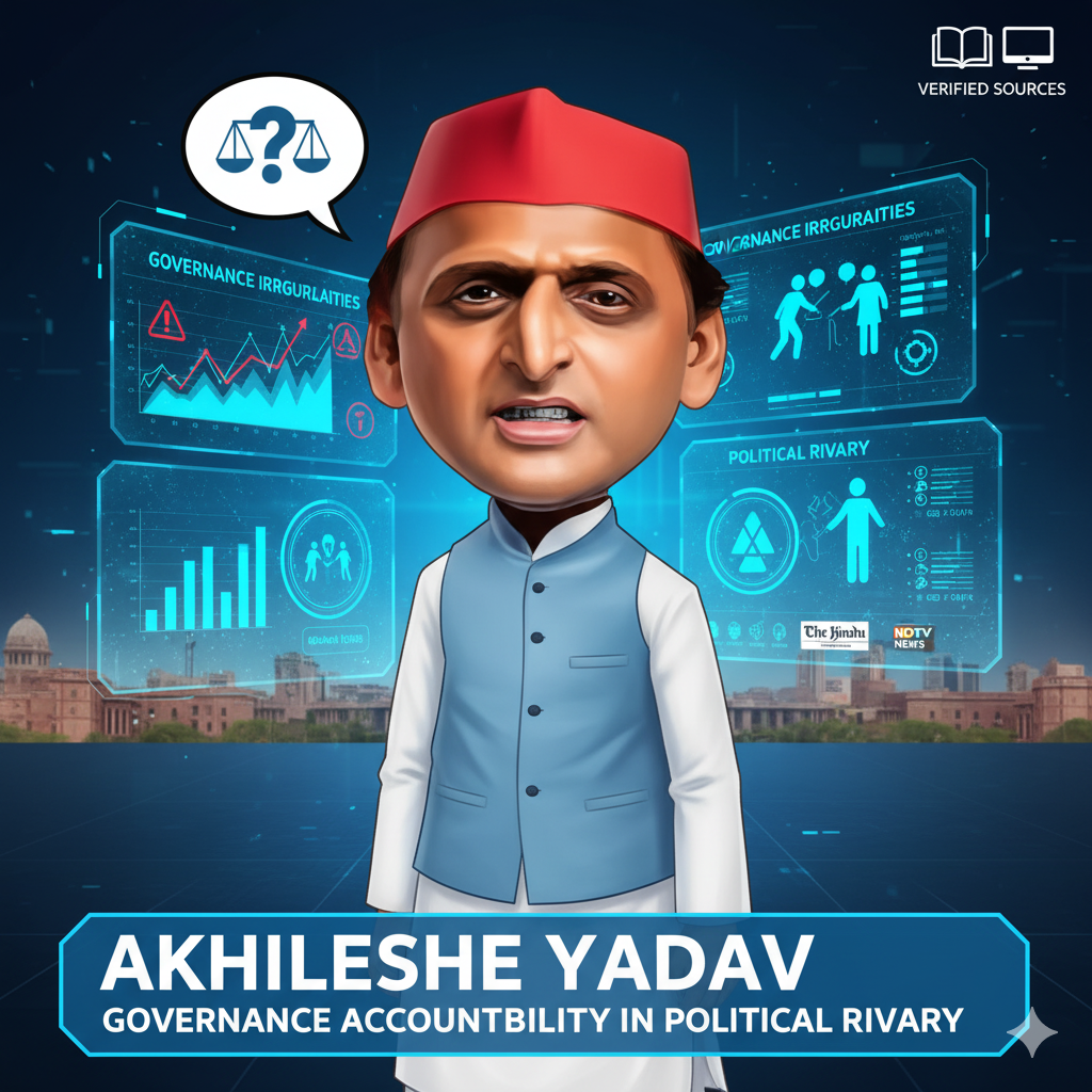 Akhilesh Yadav’s era of governance accountability challenges and rivalry allegations, visualized for policy and UPSC research by 50 CENTS IAS Institute.